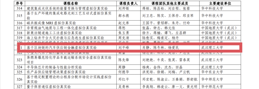刘平峰教授教学团队(肖静老师、陈冬林老师、杨爱民老师)建设的《基于区块链的汽车供应链金融虚拟仿真实验》获批第二批国家级一流本科课程的虚拟仿真实验一流课程。