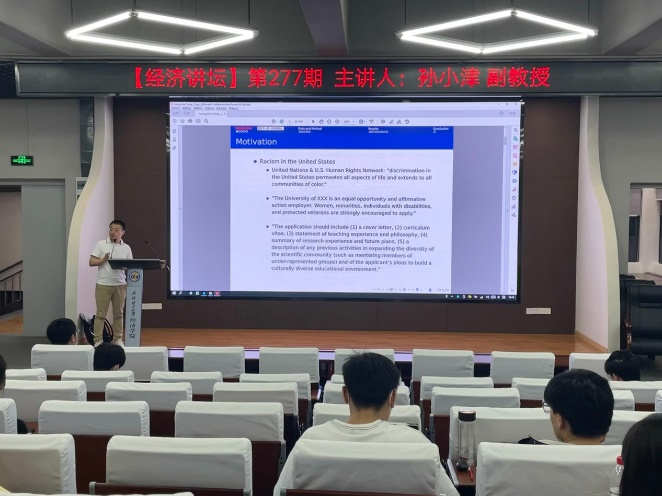 5月25日晚,第277期经济讲坛于365英国上市网站官网鉴湖报告厅举办。本期讲坛邀请了德克萨斯大学经济学终身教职孙小津副教授作为主讲人。本次讲座由365英国上市网站官网喻平副院长主持,百余名师生学生参加。